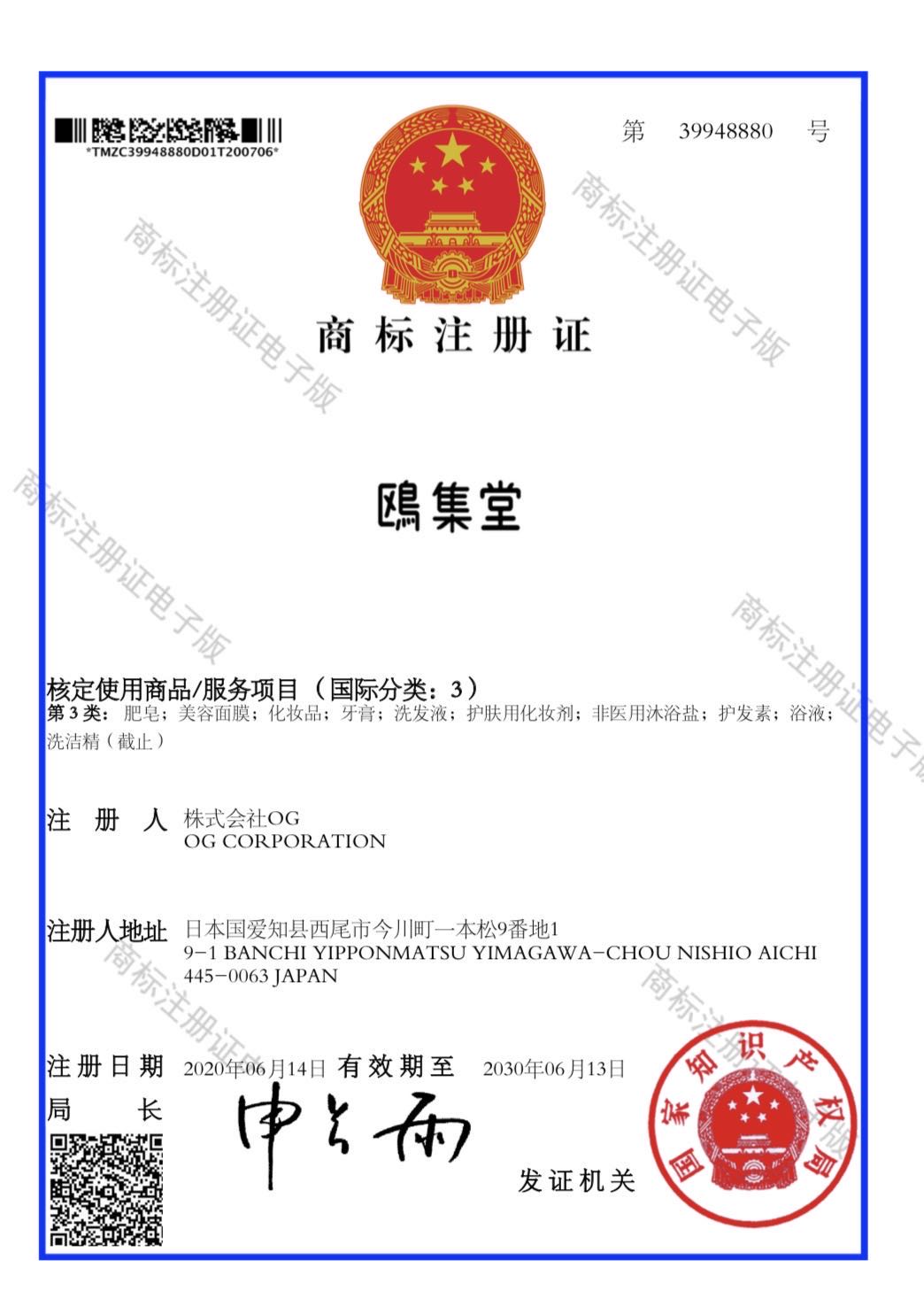 株式会社OGは「鴎集堂」の中国第3類、第5類商標権を取得しました。 登録番号 第39948880号 登録番号 第39938342号