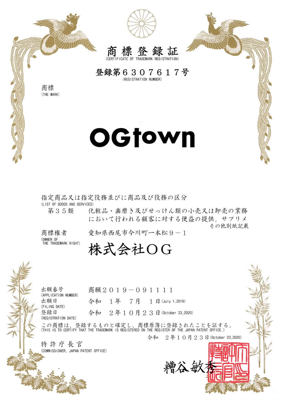 株式会社OGは「OGtown」の日本第35類商標権を取得しました。 登録第6307617号
