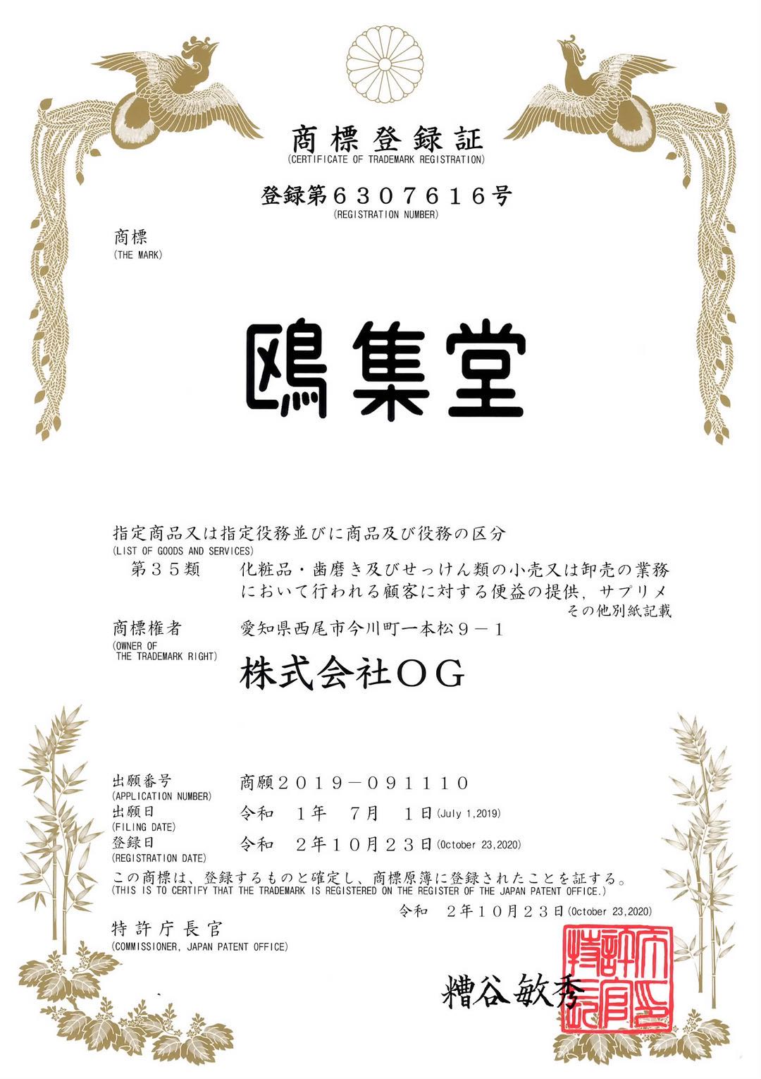 株式会社OGは「鴎集堂」の日本第35類商標権を取得しました。 登録第6307616号