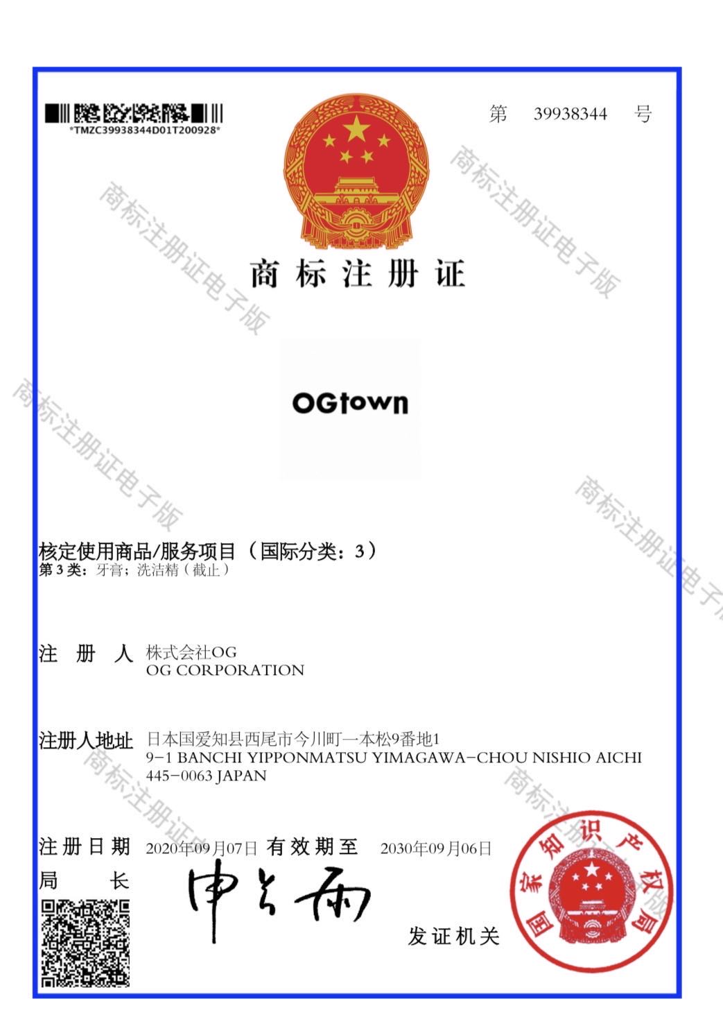 株式会社OGは「OGtown」の中国第3類、第5類、第32類商標権を取得しました。 登録番号 第39938344号 登録番号 第39936157号 登録番号 第39927085号